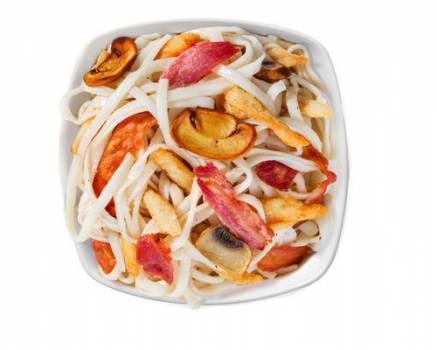 Состав: лапша удон, бекон, цыпленок, шампиньоны, чеснок, сливочный соус