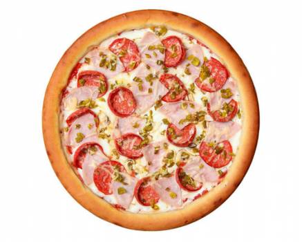 Состав: ветчина, пепперони, сыр моцарелла, сыр пармезан, грибы шампиньоны, перец халапеньо, пицца-соус, укроп