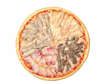 Состав: свинина, бекон, говядина, сыр моцарелла, пицца-соус, лук репчатый, цыпленок