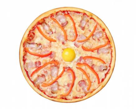 Состав: бекон, сыр моцарелла, паприка, перец болгарский, лук репчатый, пицца-соус, яйцо
